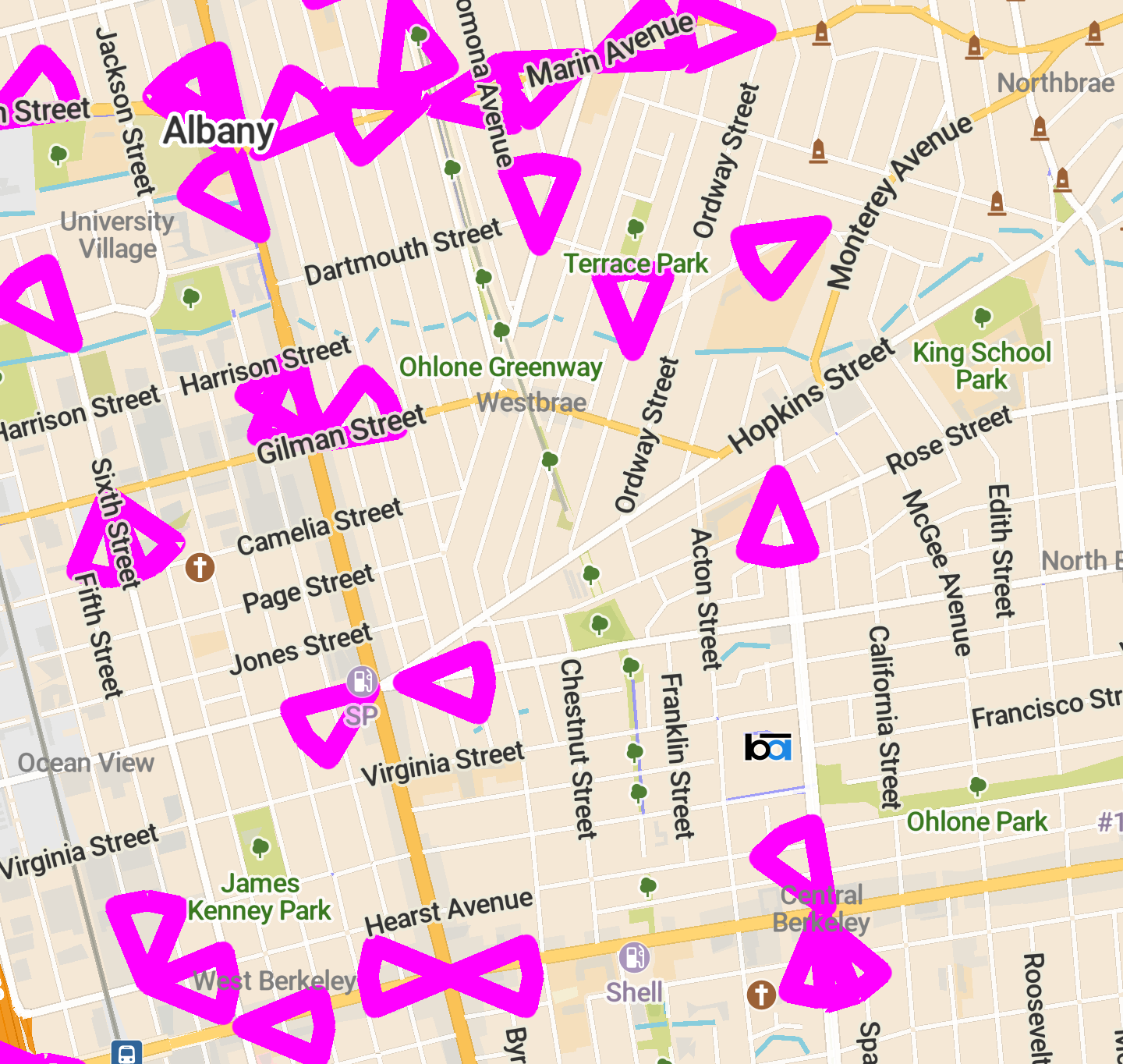 Each of those magenta objects represents an ALPR that is in the DeFlock dataset, which uses OpenStreetMap as its database. Click on any of them to learn more.